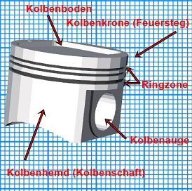 Der Kolben nimmt über seine Grundfläche, den Kolbenboden den Druck im Verbrennungsraum auf und wandelt ihn in eine Kraft um. Diese ist die Kolbenkraft. Die Kolbenkraft wird vom Kolben über den Kolbenbolzen und weiter auf das Pleuel übertragen. Das Pleuel versetzt über den Pleuellagerzapfen ( auch Hubzapfen genannt ) die Kurbelwelle in eine Drehbewegung. Diese kann dann über die Schwungscheibe ein Drehmoment abgeben.