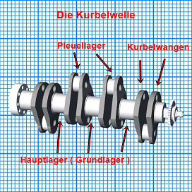 Die Kurbelwelle besitzt Pleuel- und Hauptlagerzapfen (Grundlagerzapfen) die über die Kurbelwangen verbunden sind. Die Pleuelagerzapfen nehmen das Pleuel auf. Mit den Hauptlagerzapfen wird die Kurbelwelle im Kurbelgehäuse gelagert.