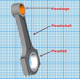 Der Kolben wird durch dem Kolbenbolzen mit dem Pleuel verbunden.Dabei ist der Kolbenbolzen im Pleuel- und Kolbenauge gelagert. Der Pleuelfuß stellt die Verbindung zur Kurbelwelle her.