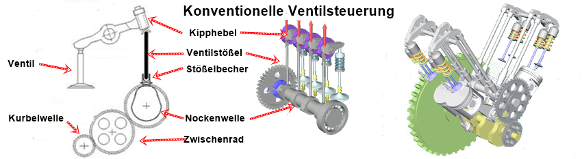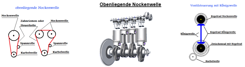 Hier erfolgt der Antrieb der Nockenwelle über Zahnriemen, Steuerkette oder Königswelle