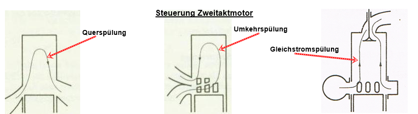 Bei Zweitaktmotoren werden die Gaswechselvorgänge in der Regel über die Kolbenkanten gesteuert. Eine weiter Möglichkeit ist, dass das Ansaugen der Frischgase in das Kurbelgehäuse mittels Drehschieber oder Flatterventile im Kurbelgehäuse gesteuert wird. Bei Großdieselmotoren werden die Abgase oftmals über Auslassventile entsorgt. ( Gleichstromspülung  )