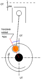 Dazu Teilt man den Kolbenhub durch 180 und erhält den Weg im mm für ein Grad Kurbelwelle. Diesen Wert multipliziert man mit dem Vorzündwinkel.
